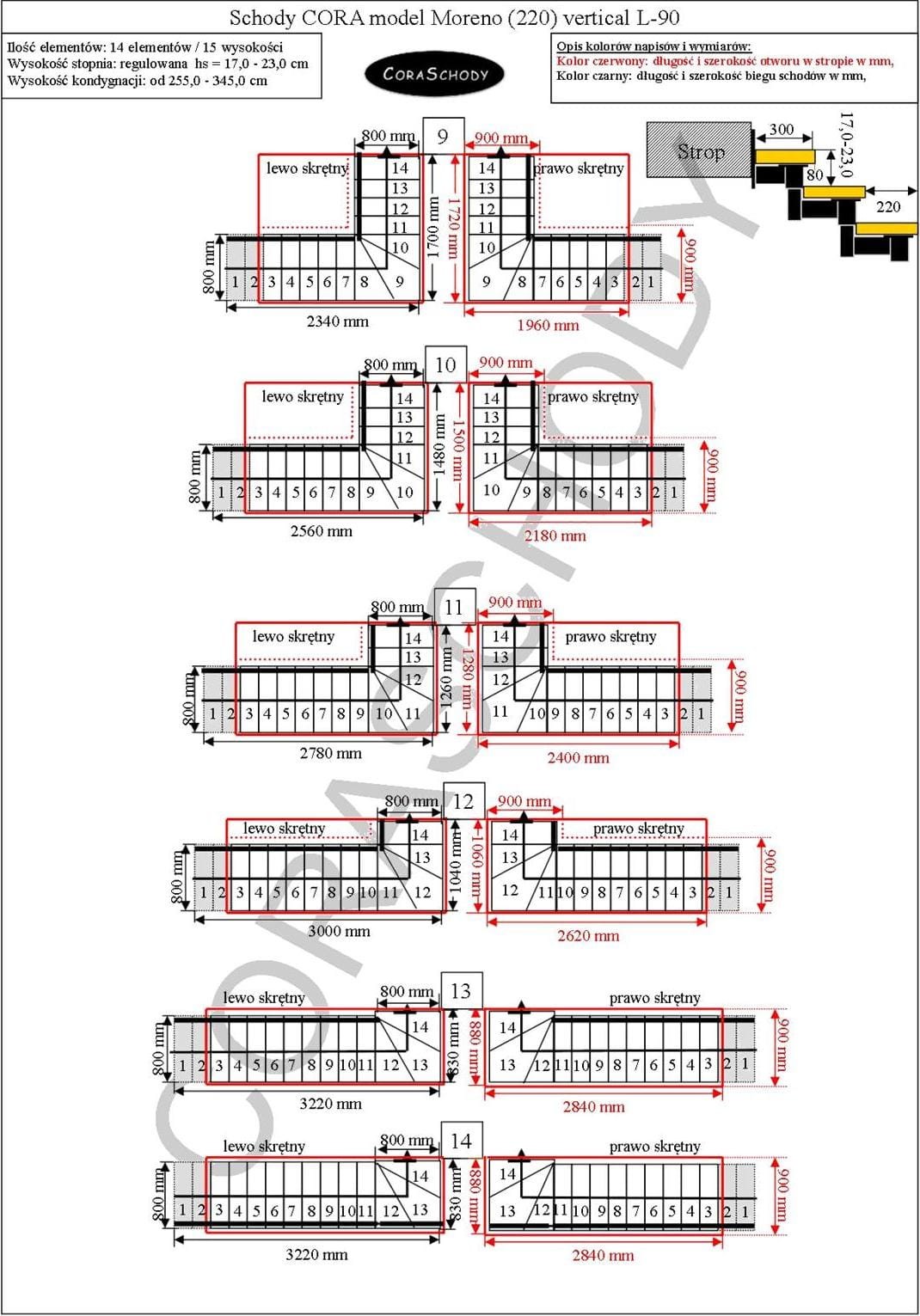 Schody drewniane CORA model Moreno 220 vertical L-90 14 elementów
