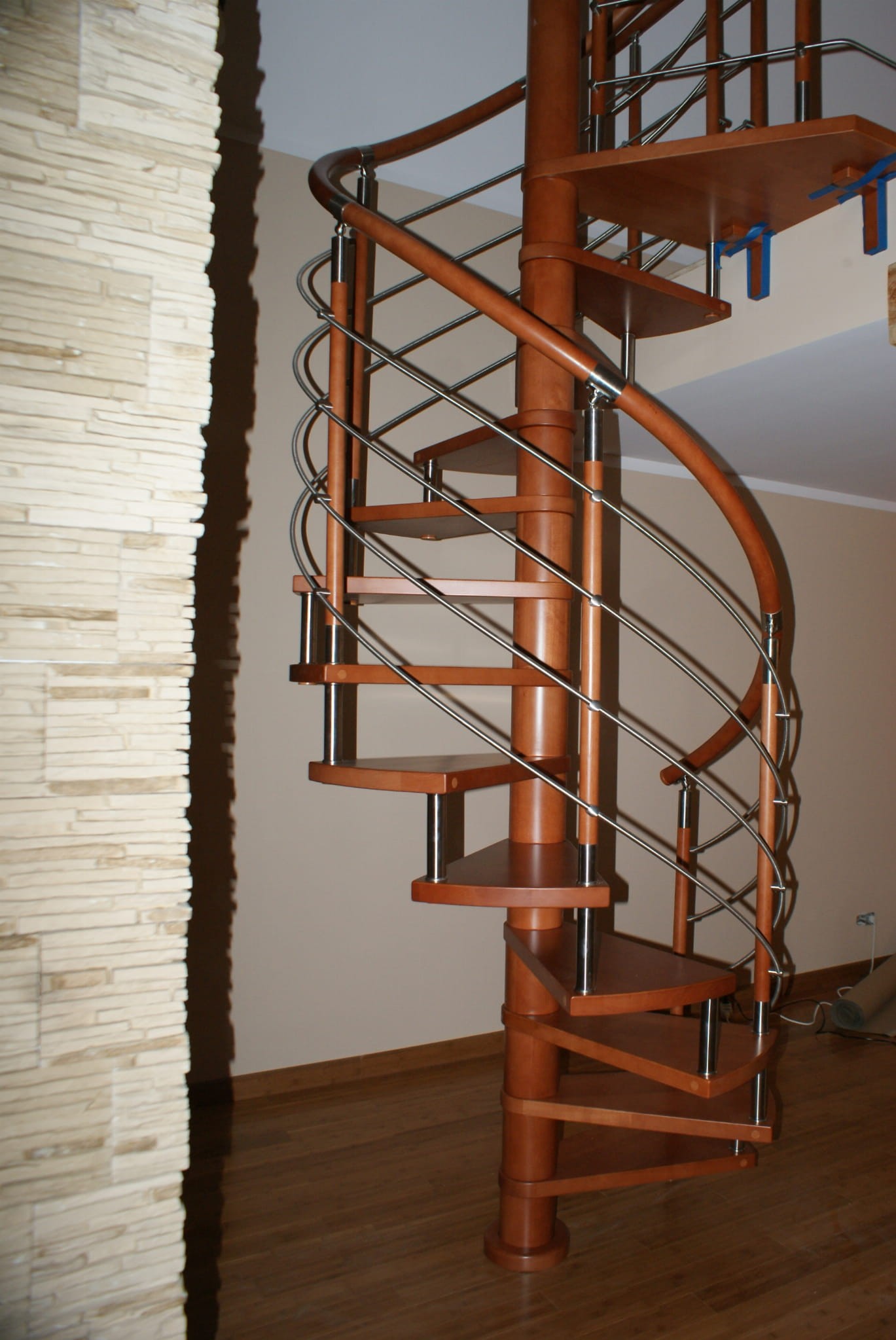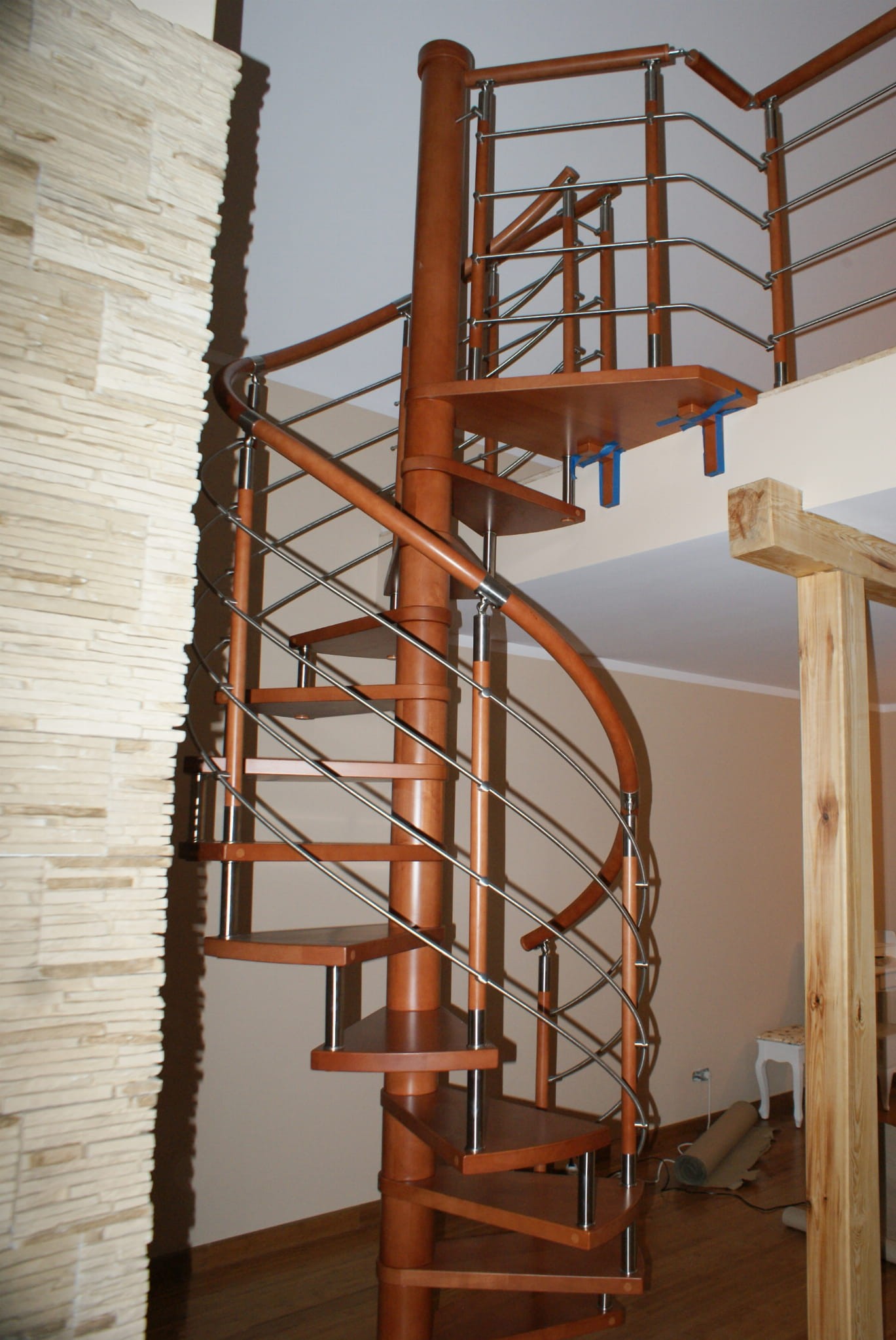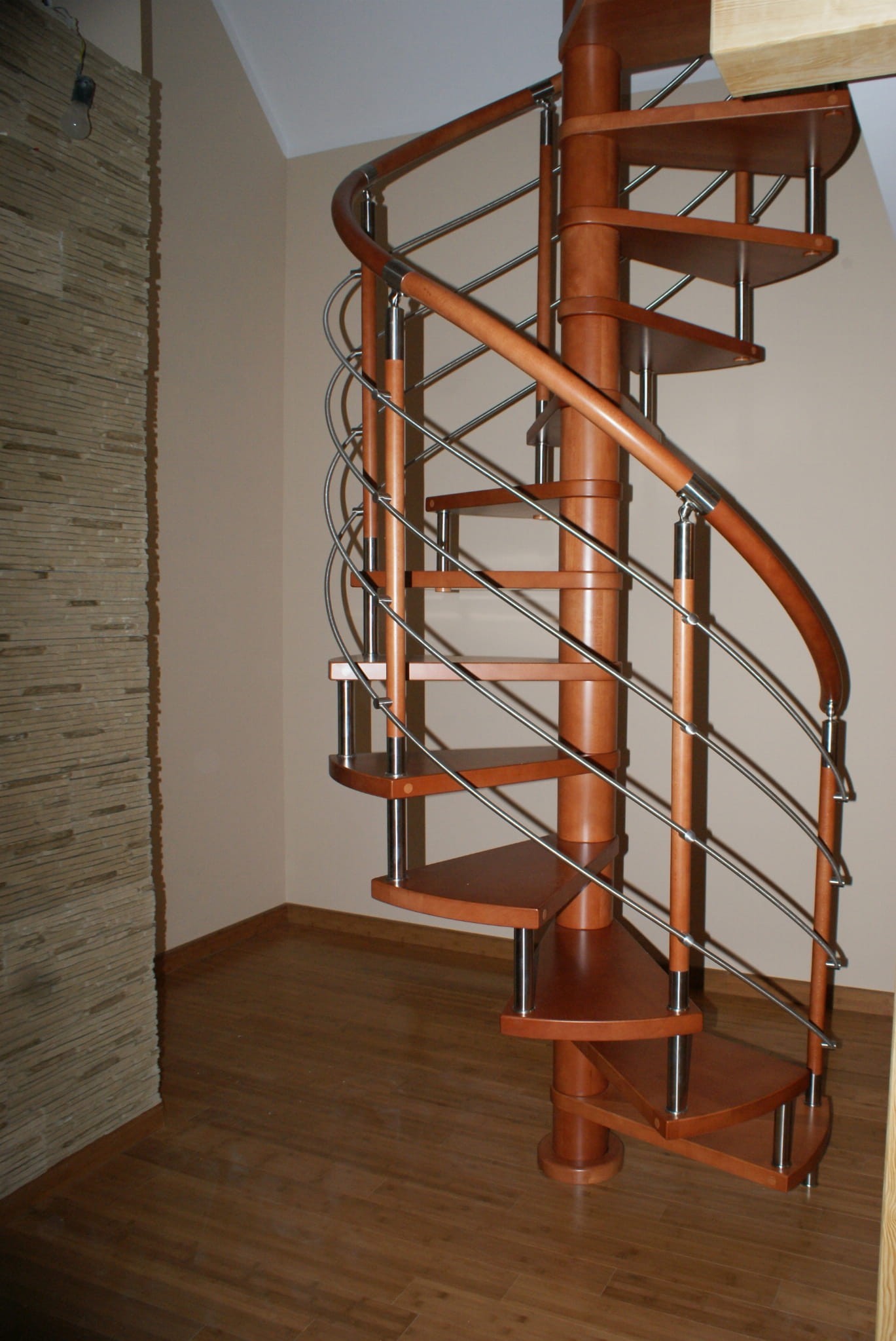 Zestaw schodów spiralnych przystosowanych do średnicy otworu w stropie o wartości 120 cm. Elementy wykonano z litego drewna (kolor do wyboru z palety barw producenta) oraz stal nierdzewna szlif. Można montować je samodzielnie, lecz producent udostępnia również usługę montażową za dopłatą.