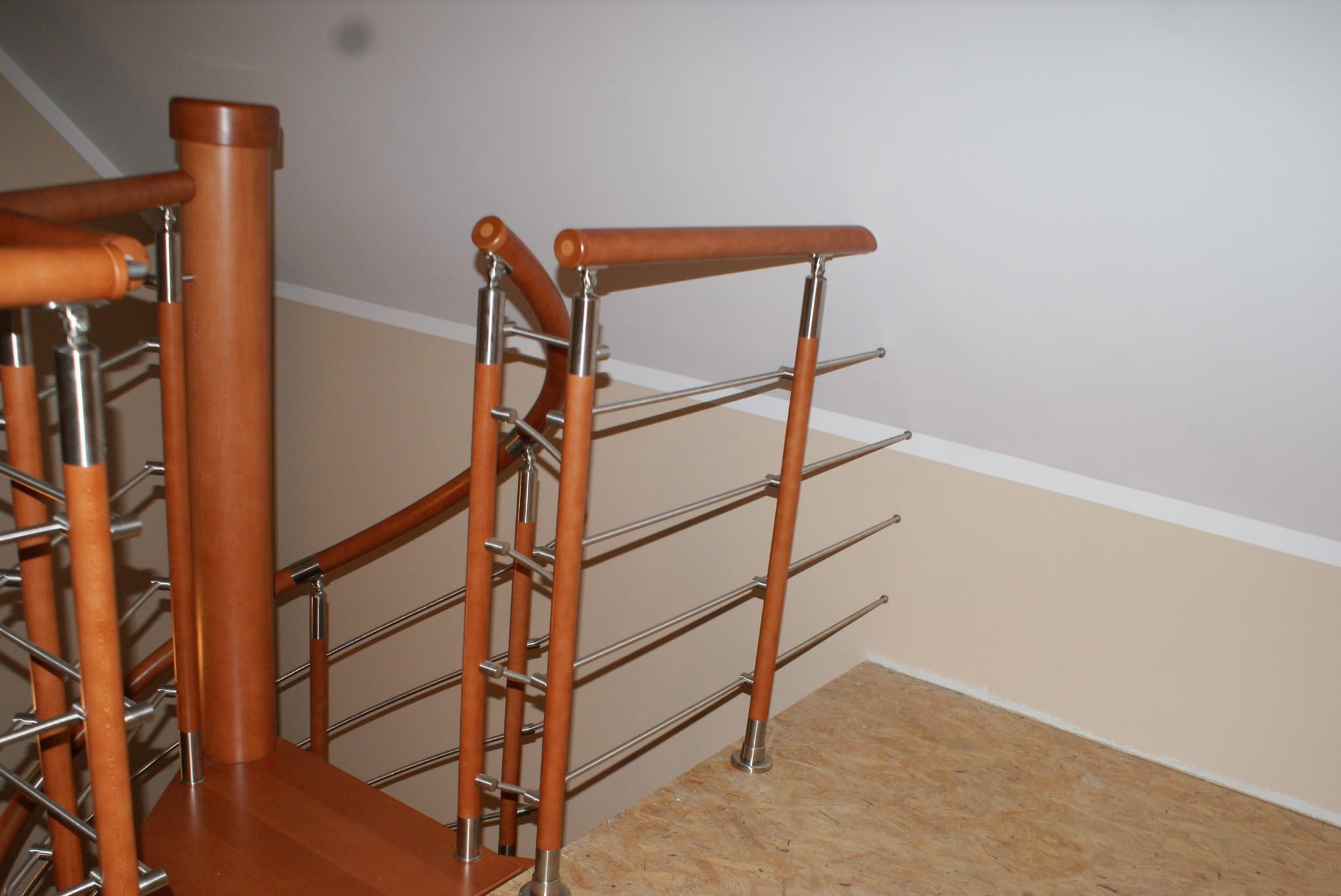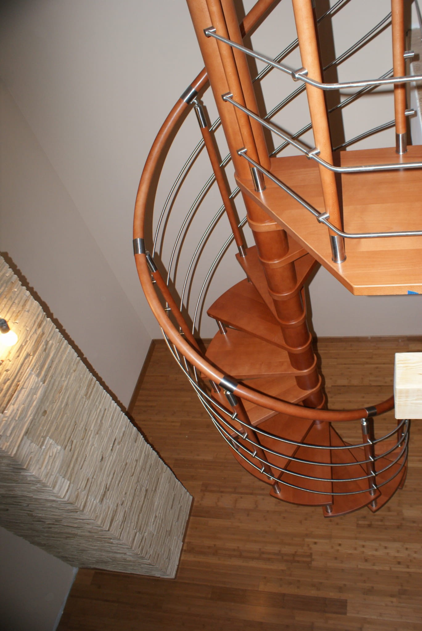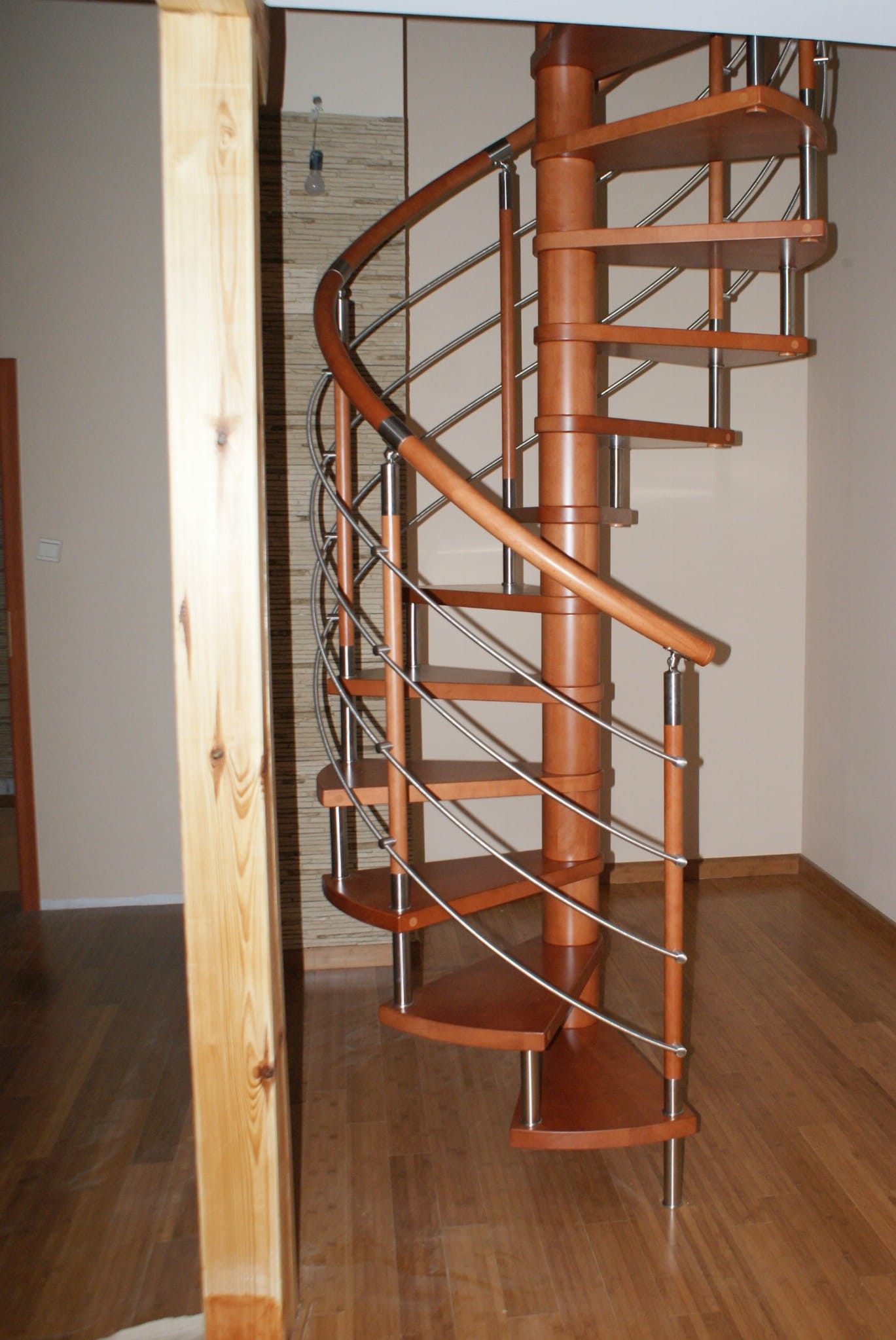 Zestaw schodów spiralnych przystosowanych do średnicy otworu w stropie o wartości 120 cm. Elementy wykonano z litego drewna (kolor do wyboru z palety barw producenta) oraz stal nierdzewna szlif. Można montować je samodzielnie, lecz producent udostępnia również usługę montażową za dopłatą.